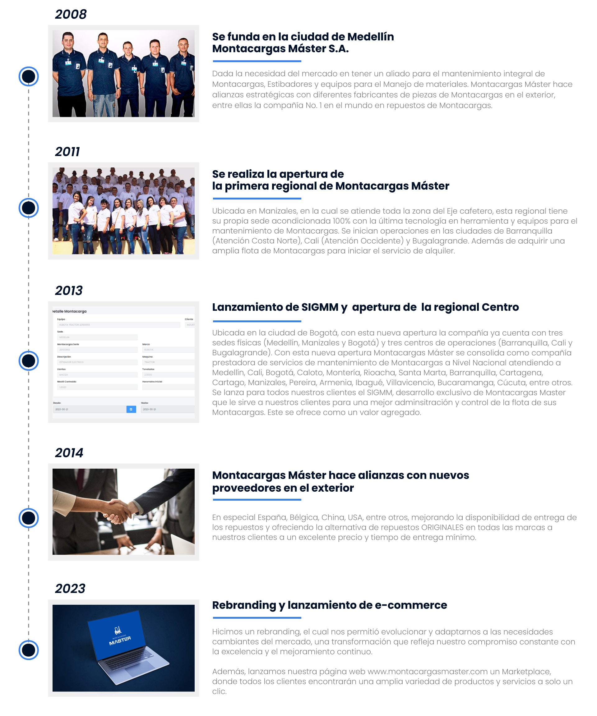 Montacargas Máster S.A.S. es una empresa dedicada a proveer a nuestros clientes una solución integral para el manejo interno de materiales, a través del diseño de servicios, la investigación, la mejora continua y la articulación con sus sistemas logísticos, logrando siempre la mejor relación costo beneficio, contribuyendo así al crecimiento y desarrollo de nuestros clientes, empleados y socios.